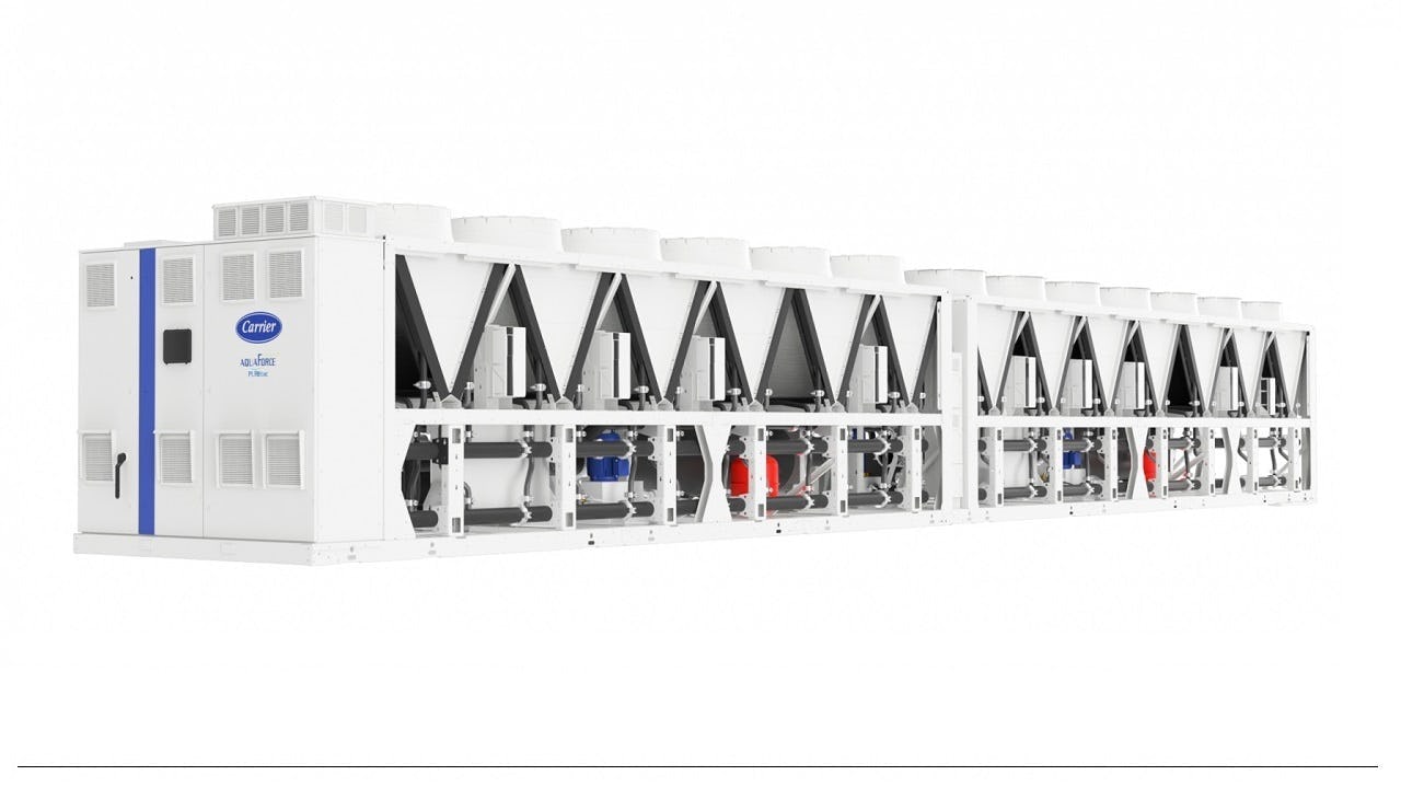 Carrier heeft met de AquaForce 30XF een nieuwe serie koelmachines voor datacenters geïntroduceerd. De luchtgekoelde HFO-schroefkoelmachines zijn leverbaar met een vermogen van 400kW tot 2.100 kW.